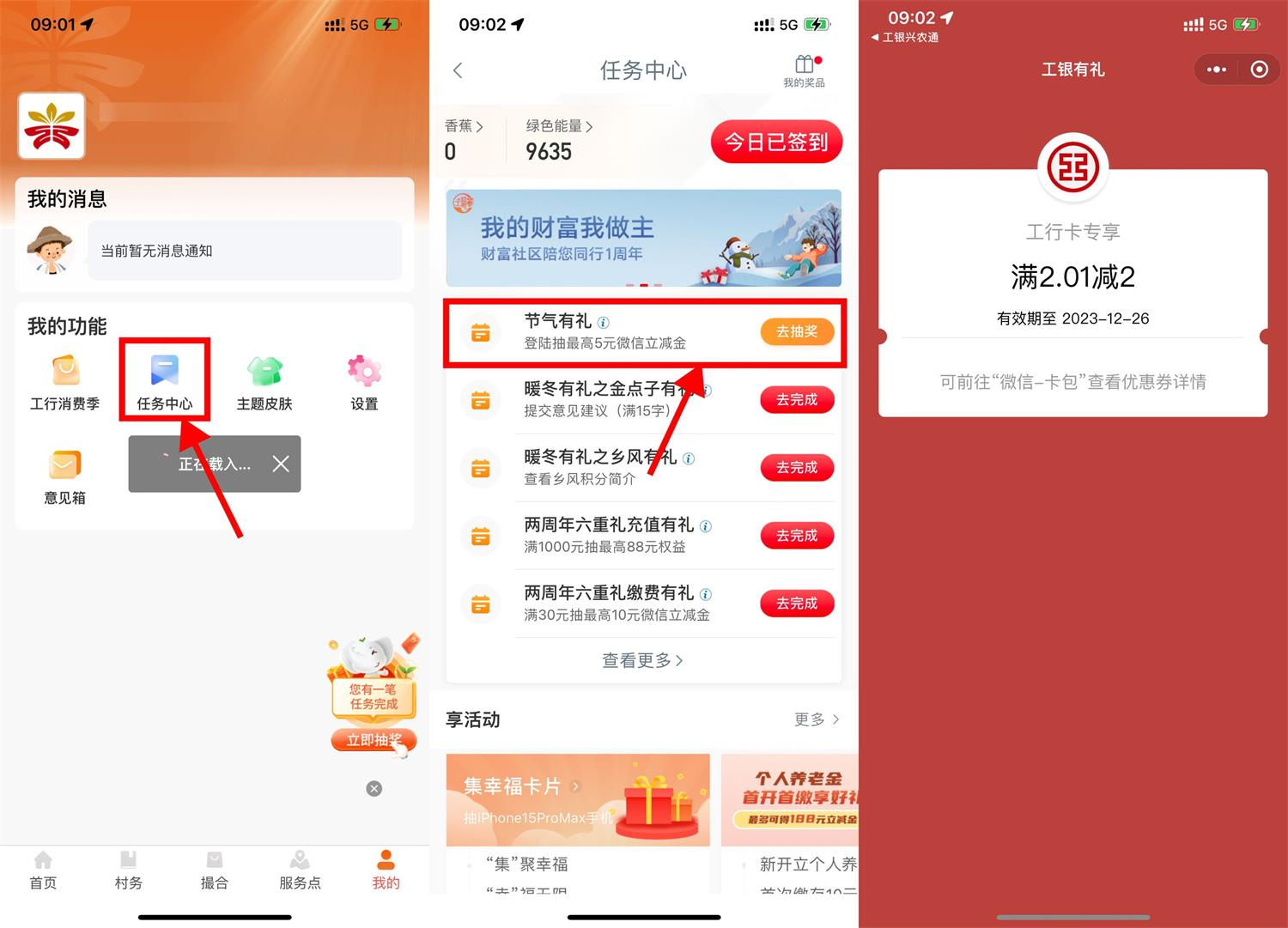 工银兴农通APP->登录自动得1次机会->进入任务中心抽2~5元微信立减金