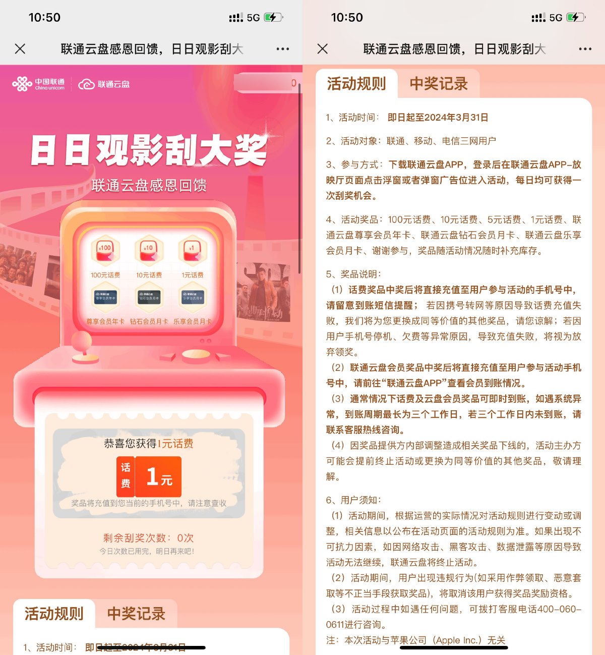 打开活动地址->每天有1次机会,直接刮一刮抽话费 非必中
