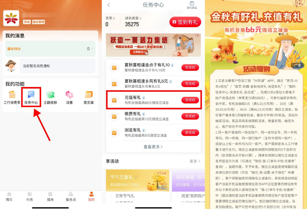 工银兴农通APP->我的->任务中心->