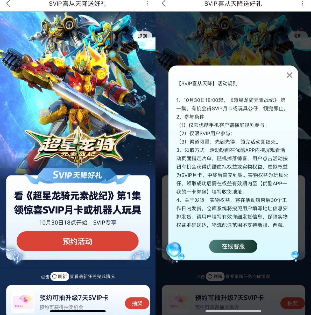 优酷APP扫码->进入预约抽7天SVIP->10月30日18点开始看
