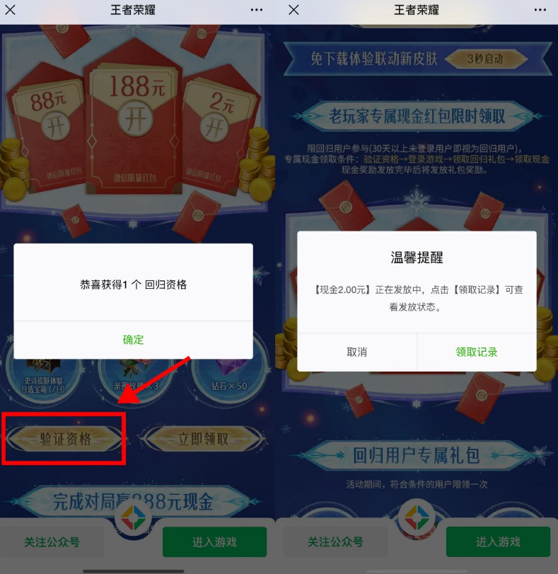 微信打开活动->30天未登录游戏的用户,先去验证资格,