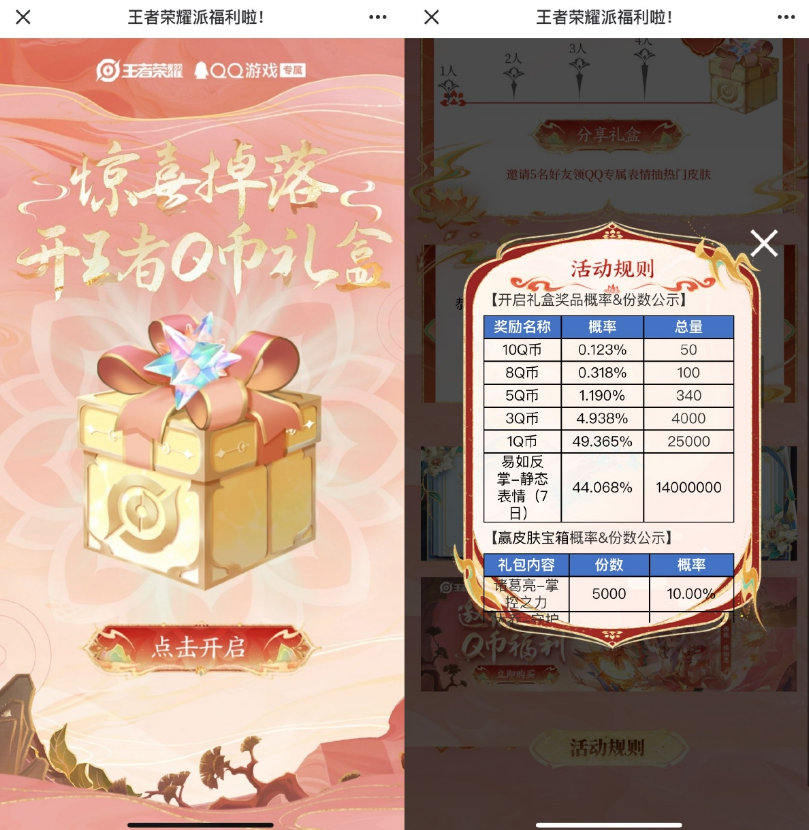 QQ打开活动->默认有1次机会,直接开礼盒抽1~10Q币或游戏皮肤等奖励