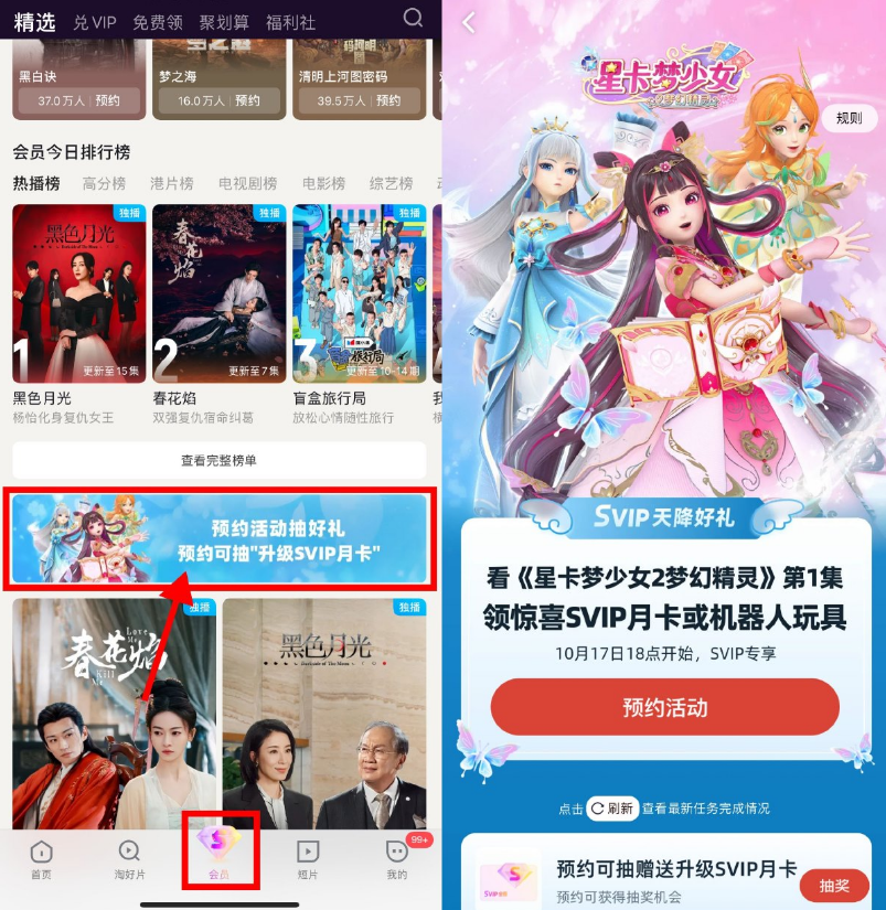优酷APP底部“会员”->下拉点横幅进入预约抽会员月卡->